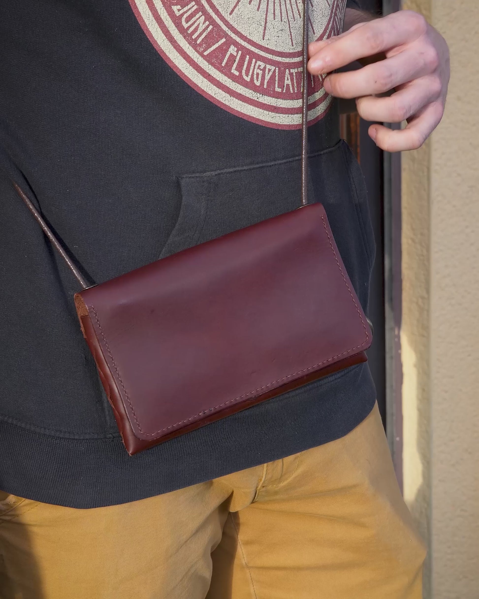 Diese Leder-Handy-Tasche vereint die Funktion eines Handy-Cases mit der Praktikabilität einer Geldbörse. Sie ist für Komfort und Stil entworfen, sorgfältig von Hand vernäht und ideal für deine täglichen Abenteuer. Der Schultergurt ist verstellbar oder auch abnehmbar, je nach Präferenz. An der Außenseite ist zusätzlich ein D-Ring an dem man z. B. einen Schlüssel oder Werksausweis befestigen kann.